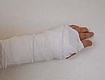 最初に登場するのは嫌味なドクター(担当医ではない)がしぶしぶ作ってくれたギブス。手の内側をがっちり固定してしまうのでなんにもできない。印象としても大袈裟であり、不格好であった。検査後、「できるだけ使うようにした方が良いよ」という担当ドクターの一言で、あえなくボツにされる。使用期間はわずか一週間。 |